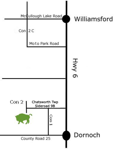 We are located in Grey County, north of the town of Durham south of the city of Owen Sound Just west off Hwy #6
